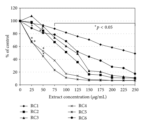 A DPPH szabadgyökfogó tevékenysége. A Rubus caesius kivonatokkal redukált gyökök %-os aránya a tiszta metanolos tevékenységhez viszonyítva nem-reduktív kontroll beállításokhoz képest (0%-os redukció) beállítva